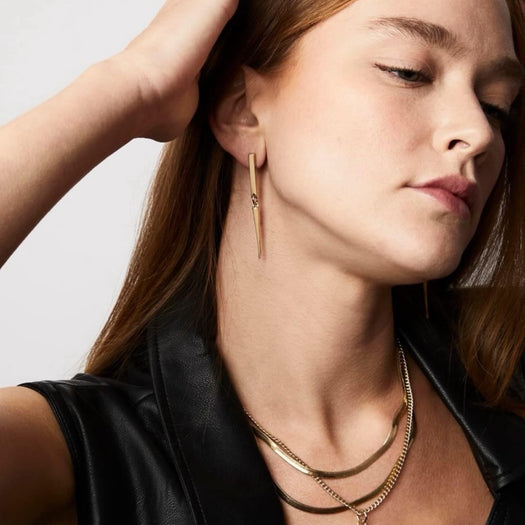 Looking for the perfect way to add a little edge to your everyday style? Meet the Sylvia Spike Earrings—a sleek, modern take on the classic drop earring. Designed for the bold, the confident, and those who love a touch of rebellion in their accessories, these earrings strike the perfect balance between effortless elegance and downtown cool. Crafted with custom gold plating over brass, the Sylvia Spikes feature a sharp, tapered 2” drop that gives just the right amount of drama. Pair them with a leather jacket for a tough-luxe vibe or wear them with a sleek black dress for a modern, minimalist statement. Either way, they’re guaranteed to turn heads.