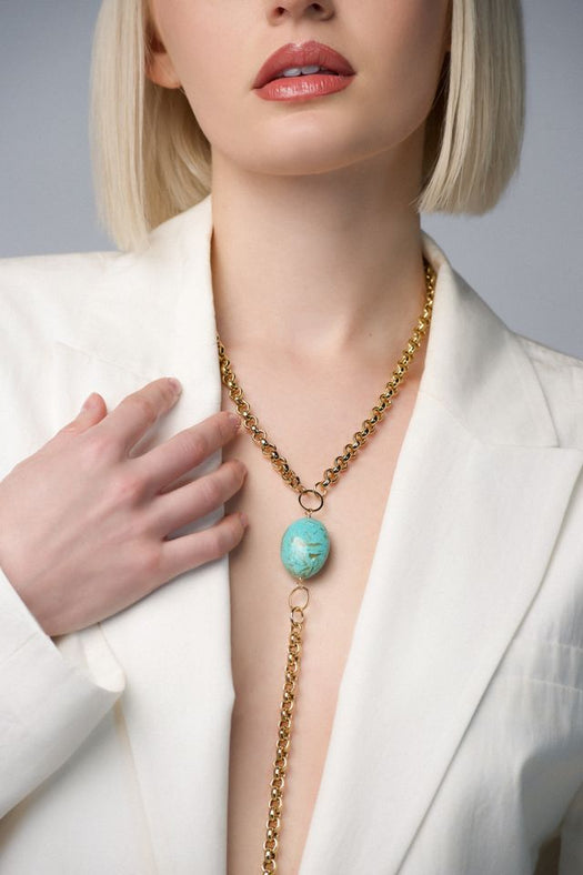 Turquoise Rhonda is a bold, timeless style. This lariat brings just enough personality with the gorgeous turquoise centerpiece to make that summer statement.